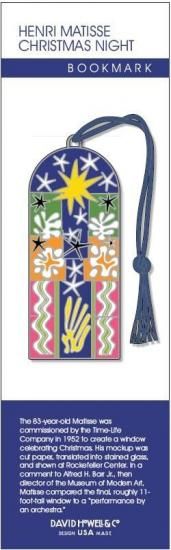 晩年マティスは病を得て九死に一生を得て、体力的な限界から両手のみを使って作品を生み出すことのできる切り絵に転向します。このしおりはロックフェラーセンターのために製作したステンドグラス「クリスマス・イブ」から。
